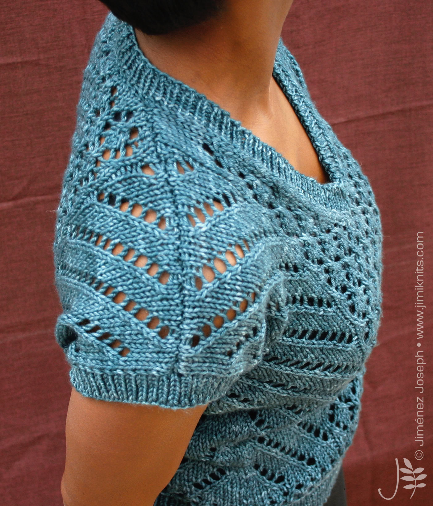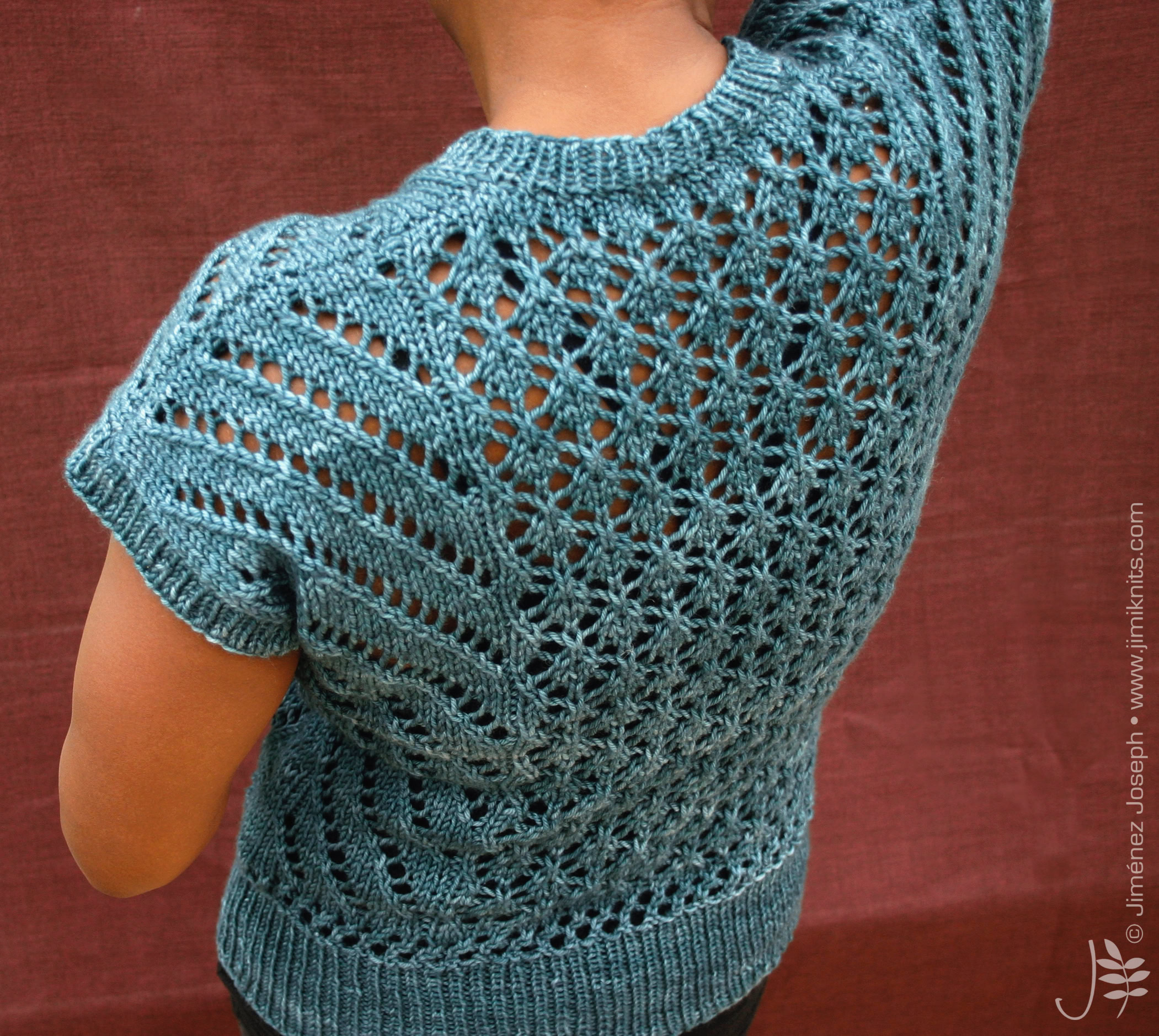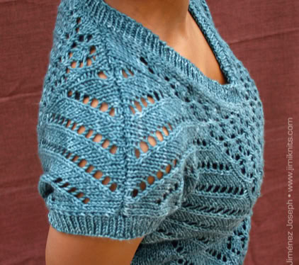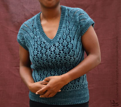 This is The Boss. A commanding, yet intriguing open gauge lace top, with V-neck and integral short sleeves. It is knitted flat in 2 pieces (front and back) from the bottom up, then seamed together. The hemline, the neck line and sleeve ribbings are picked up, then worked in the round using circular needles.