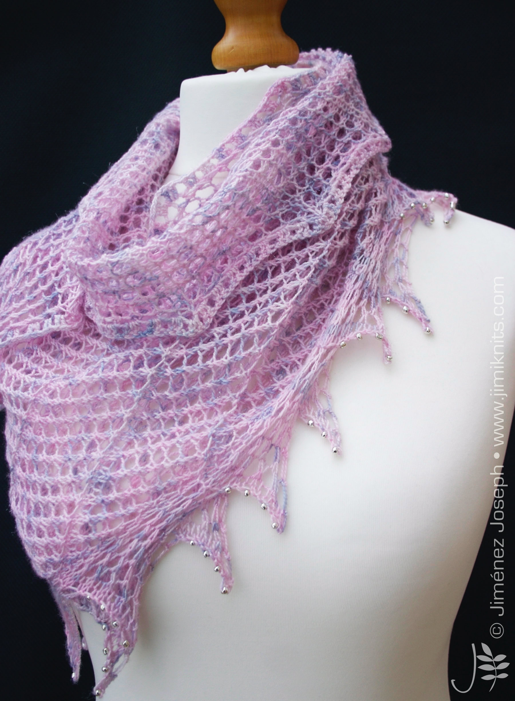 Castle of Dreams is a shawlette that is knitted sideways from end to end, encompassing a pretty mesh fabric with delicate fronds adorned by shiny beads, then finished off with a simple crochet edging. A satisfying knit that uses only one skein of fingering weight (4ply) yarn.