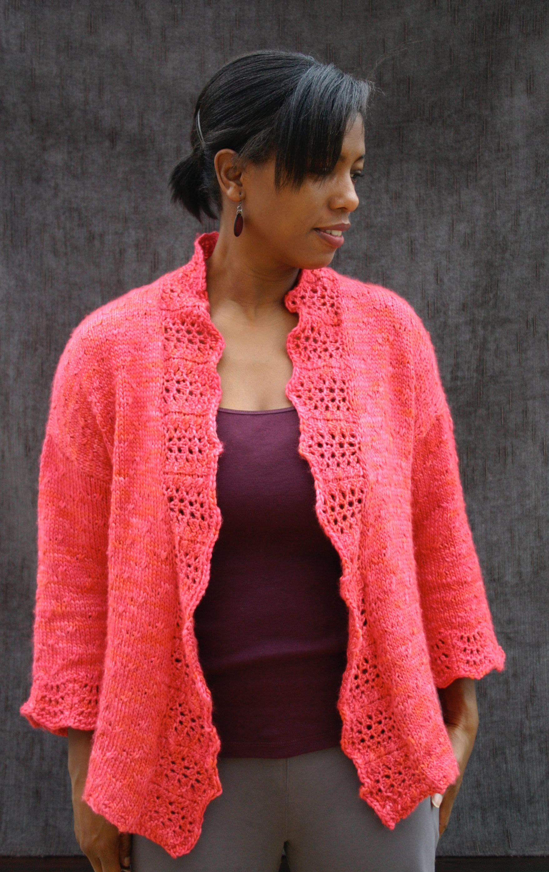 This cardi has a loose gauge and loose fit with no shaping, which allows for the fabric to drape nicely over the body. For best results, choose a yarn with a large percentage of silk or bamboo. Worsted/Heavy Worsted or Aran weight yarns are recommended. There is approx. 4” to 6” (10 to 15cm) of positive ease included in the garment.