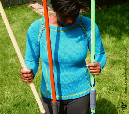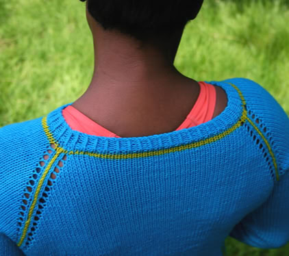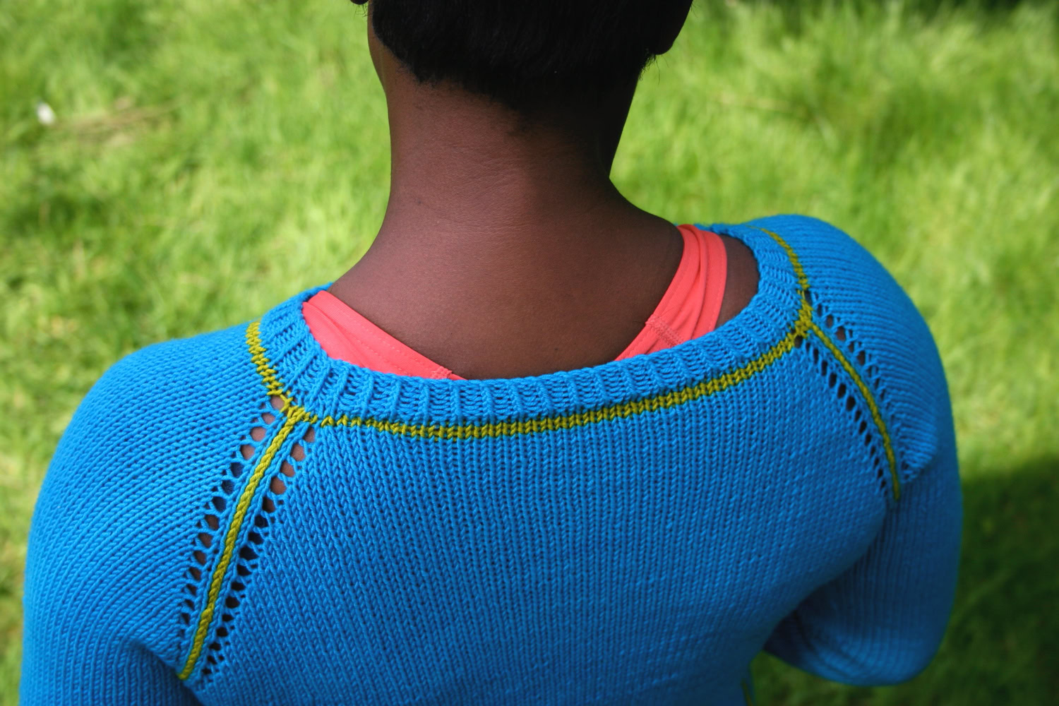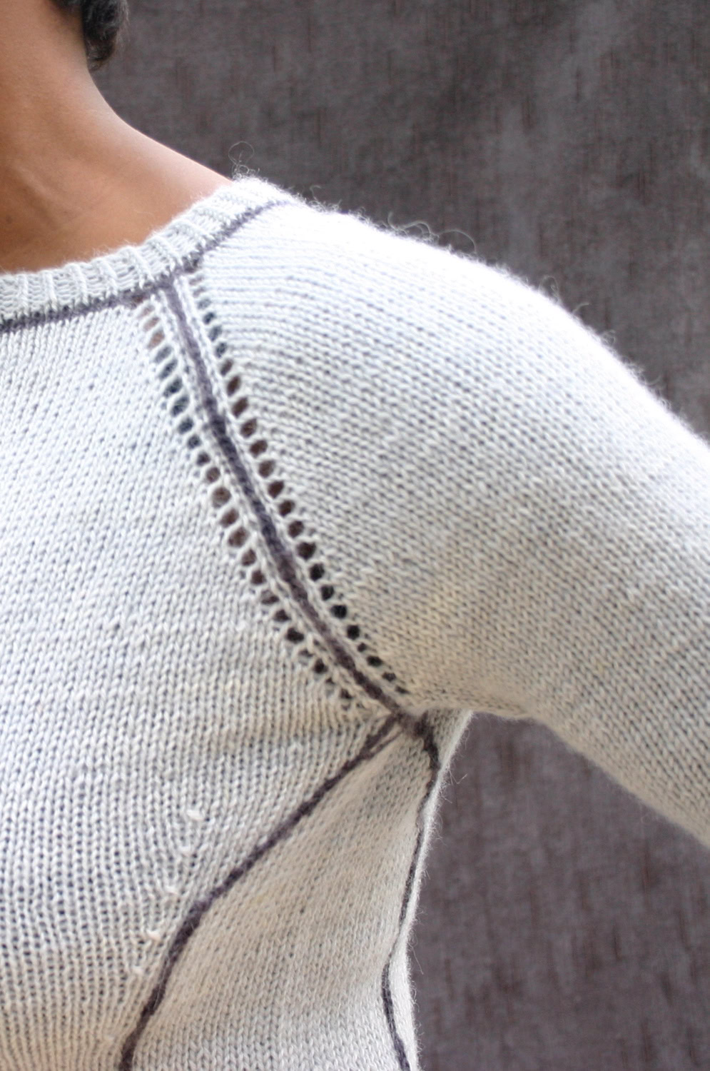 Javelin is a unisex sweater with raglan sleeves and contrasting lines that follow the sweater from neckline to hemline. It is knitted from the top-down, seamless and in the round. It contains 4 contrast colour lines that are carried vertically throughout the length of the sweater on separate yarn bobbins.