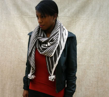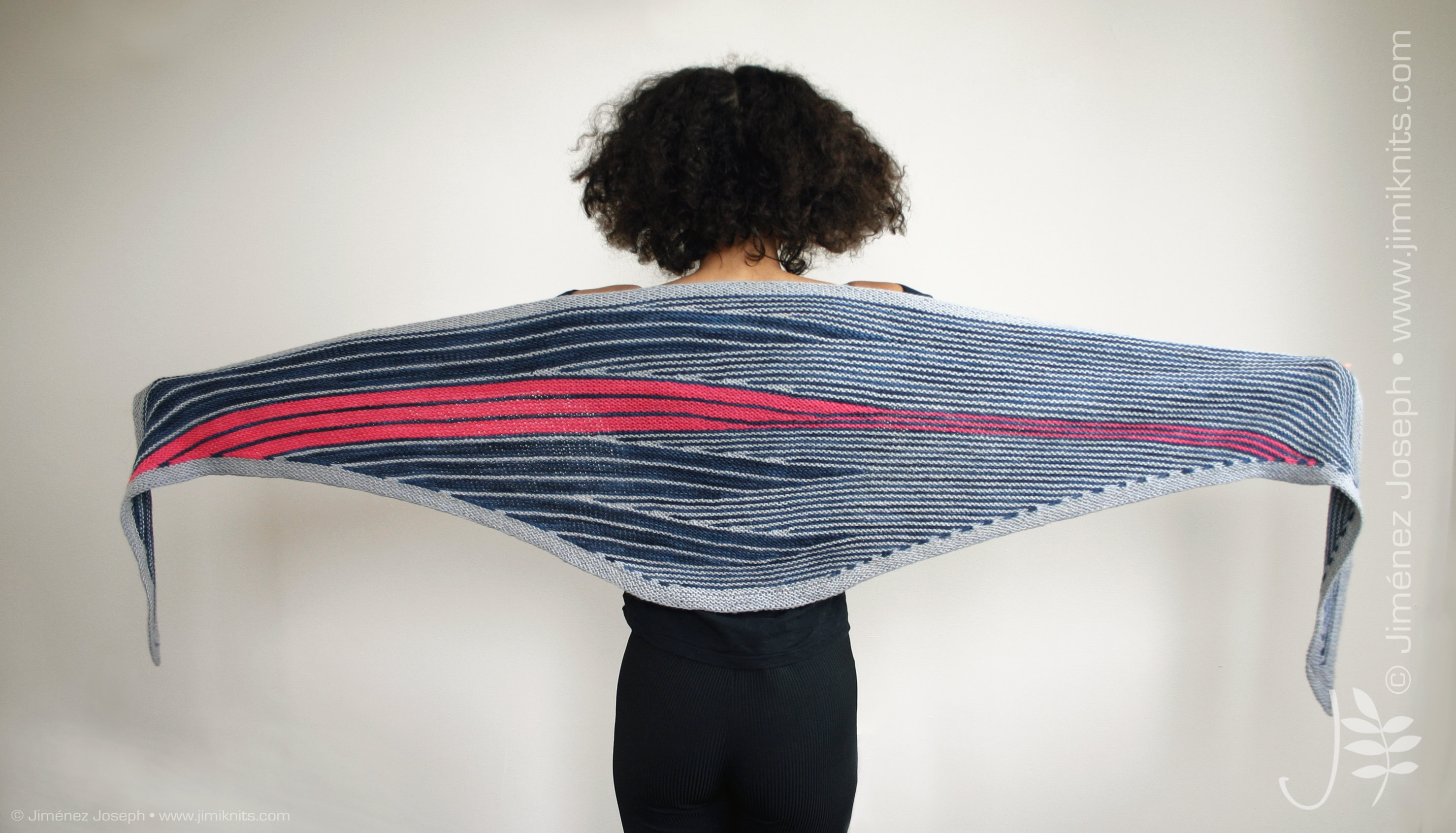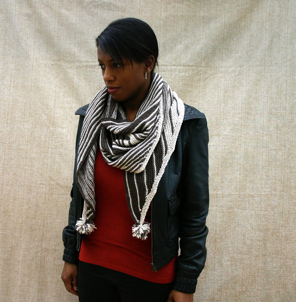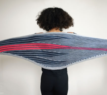 LongStuff - A long and narrow shawl, made using 2 or more colours of yarn. It is knitted from the bottom-up with meandering short row stripes that build up as you go. The edging is picked up and knitted to form a neat border. Go as creative as you like with colour!