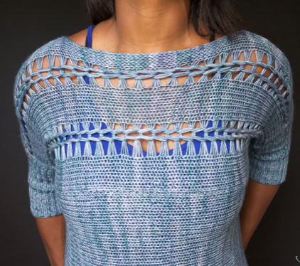 Pixham - Addi Express is a relaxed-fitting top featuring braided stitches that run across the upper body. It is made sideways, flat and in pieces using the Addi Express King Size (46pin) Circular Knitting Machine, while the ribbing trims are hand knitted in the round using circular needles. The braiding feature is worked using a crochet hook. The top is designed to fit loosely and have an open fabric.