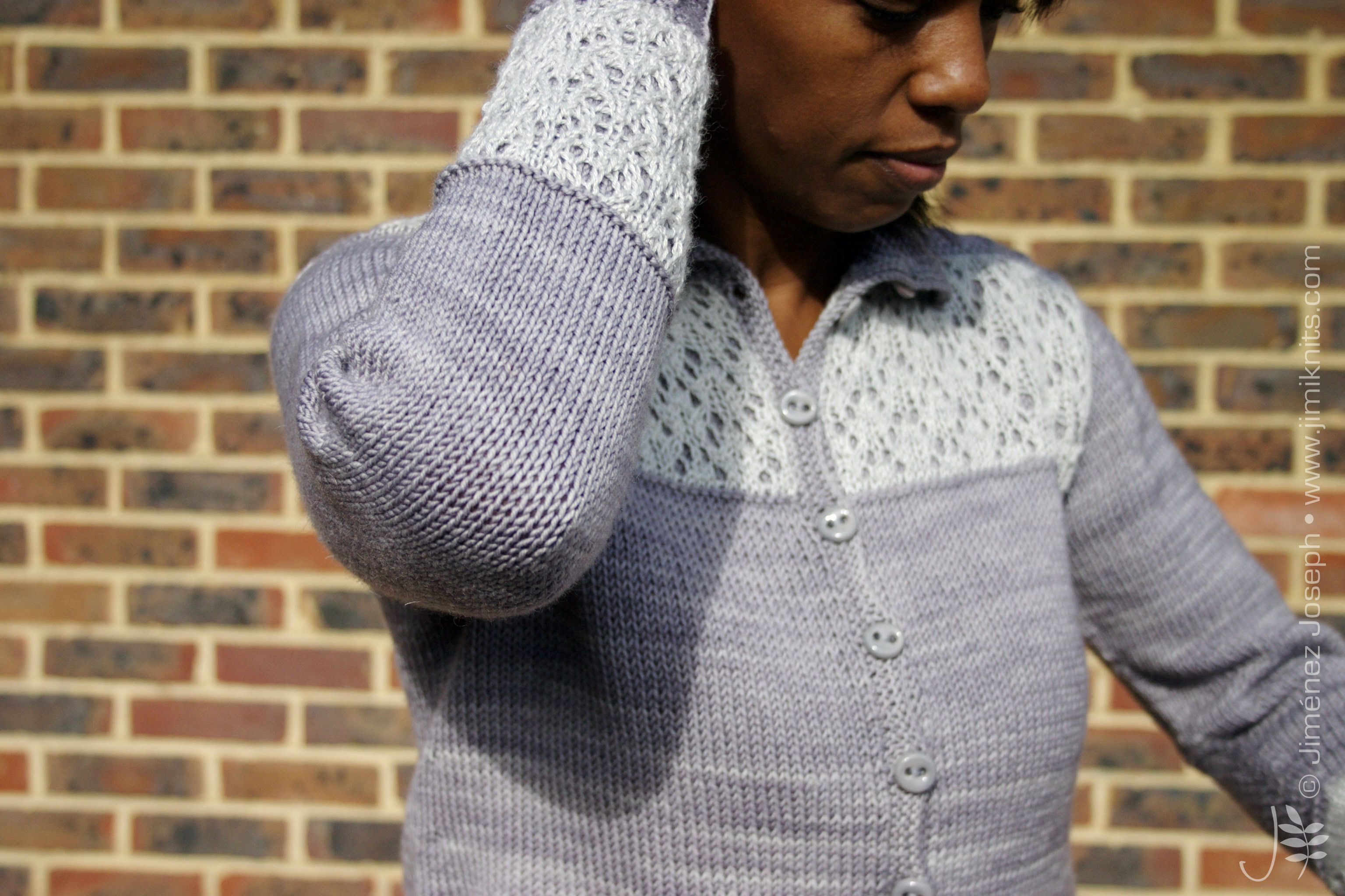 Polesden Lacy has a nostalgic style with a modern twist. It’s a blouson style cardigan with slimline sleeves, made using a DK/Worsted weight yarn base and a contrast colour lace overlay in 4ply/Fingering weight yarn. It is worked flat, from the top-down for the upper half. It is then joined together to work seamlessly down to the hemline, allowing you to adjust for your desired length.