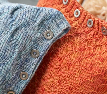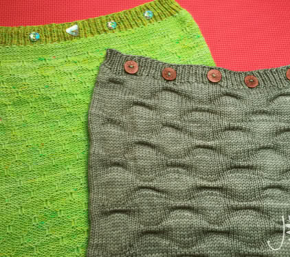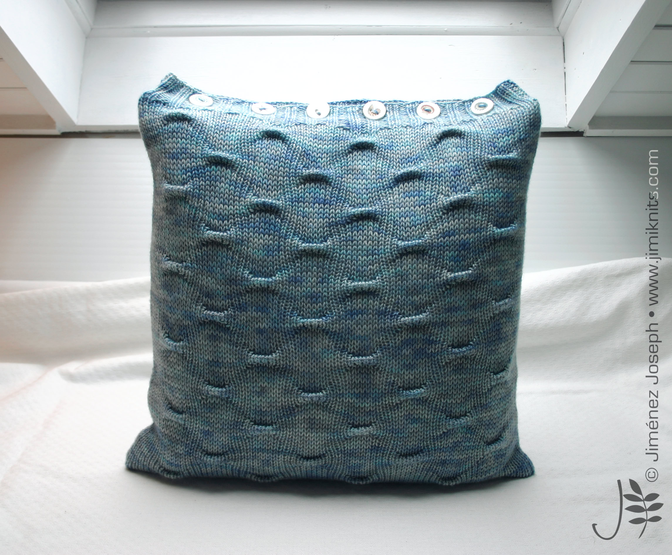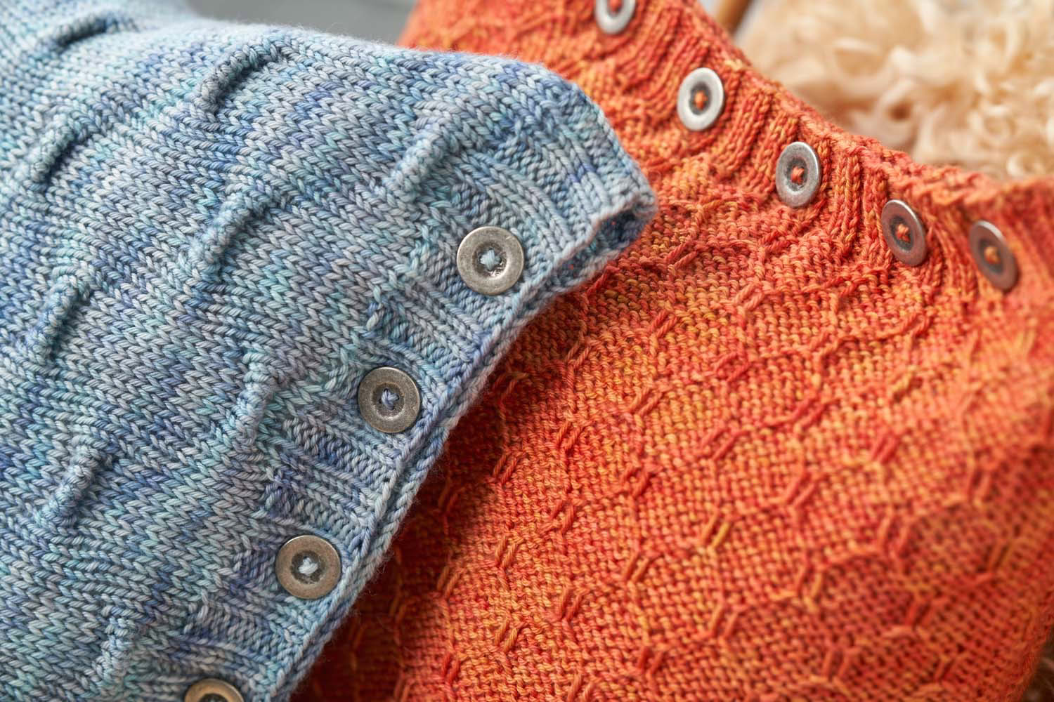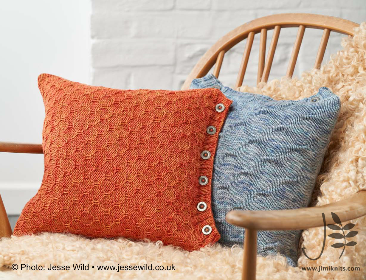 Saturnus Cushions - these cushion covers are cast on at the button band. By using the working yarn, rather than a provisional waste yarn, for the crochet cast on, the cast-on edge matches the cast-off edge perfectly. The body of the cushion is worked back and forth in your chosen grab stitch pattern, before ending with a buttonhole band. The cover is then seamed with mattress stitch and buttons are sewn on to the button band. Fill your cushion cover with a cushion pad and enjoy your work!
