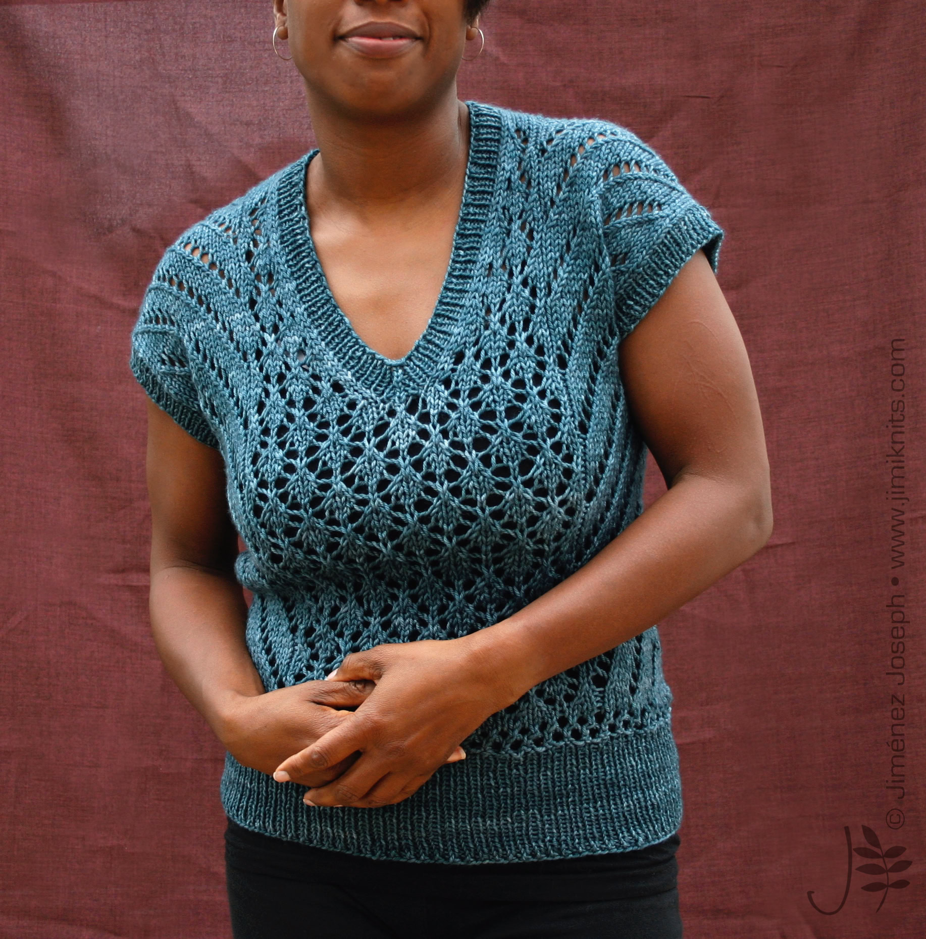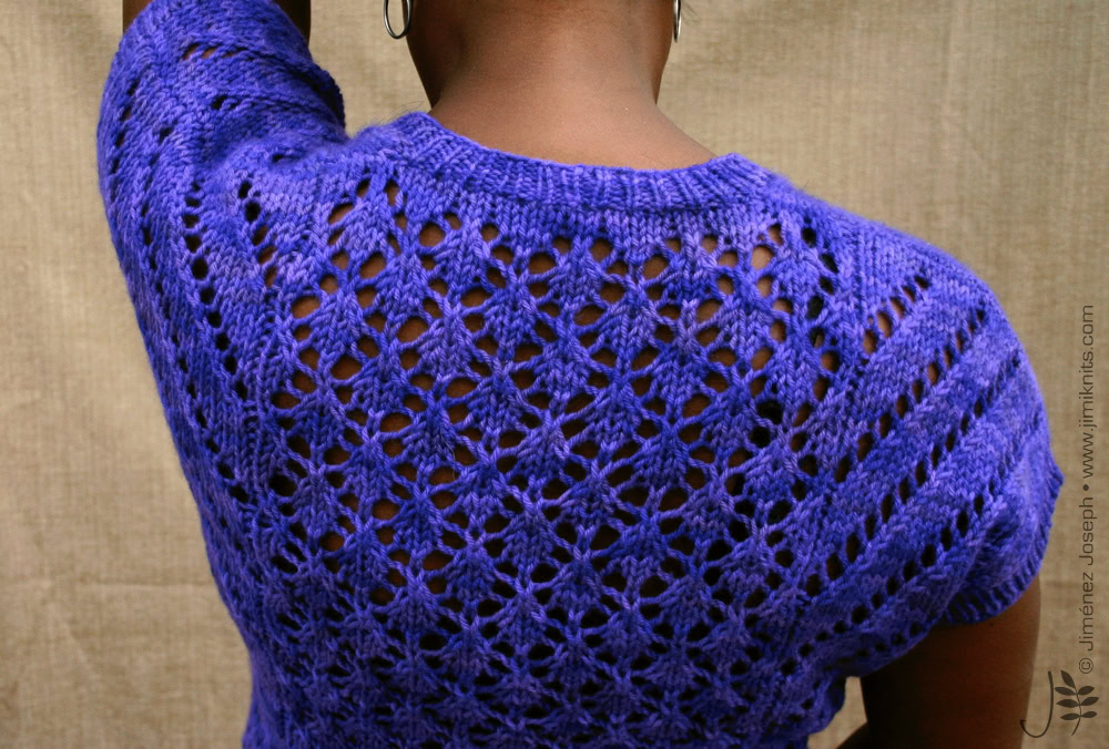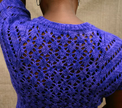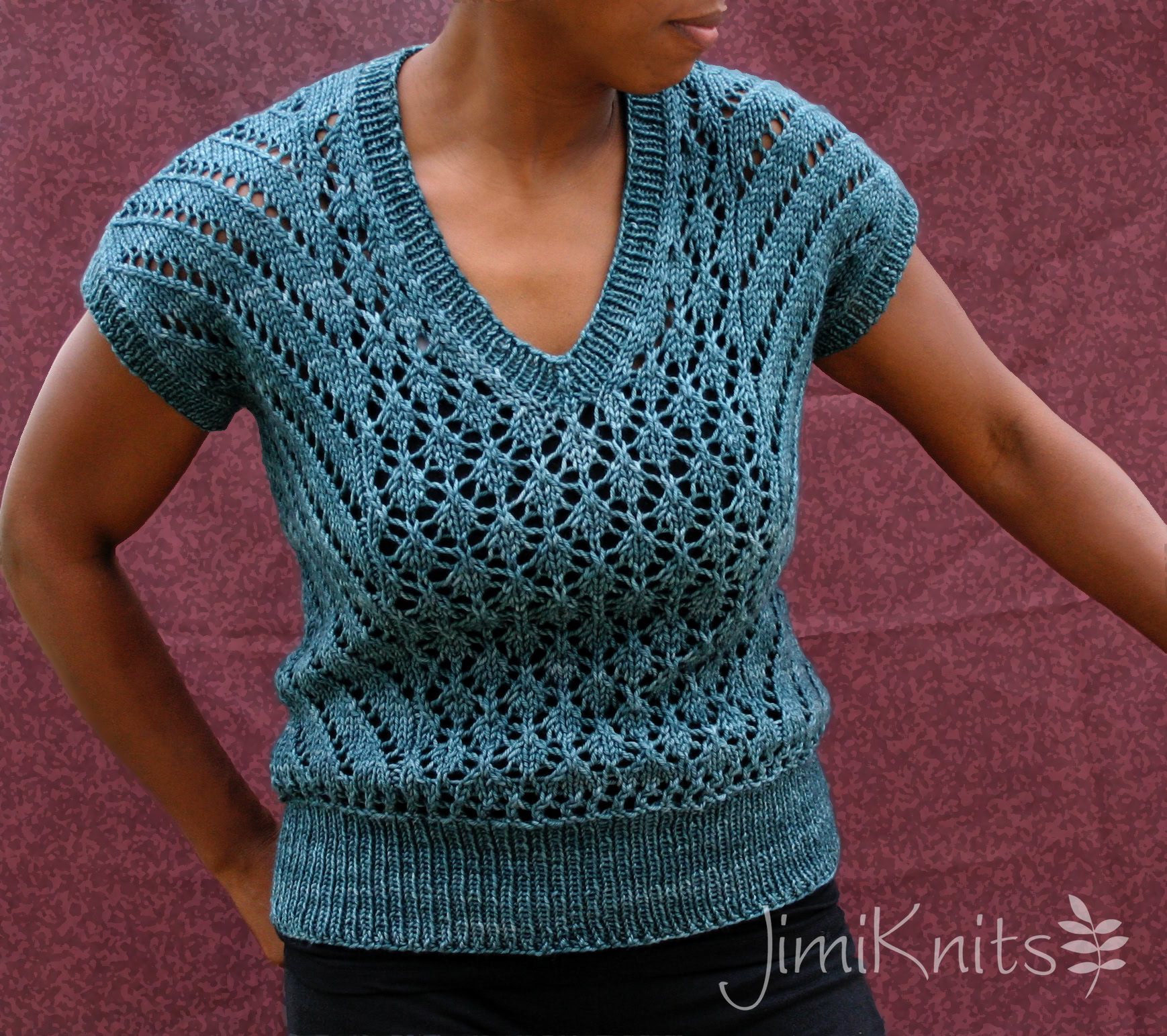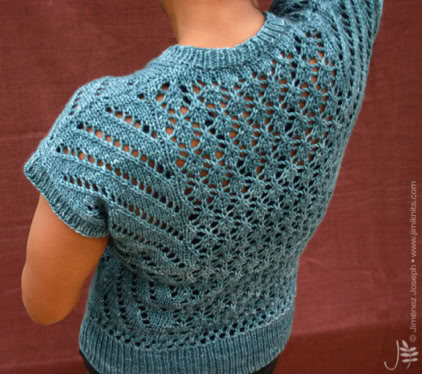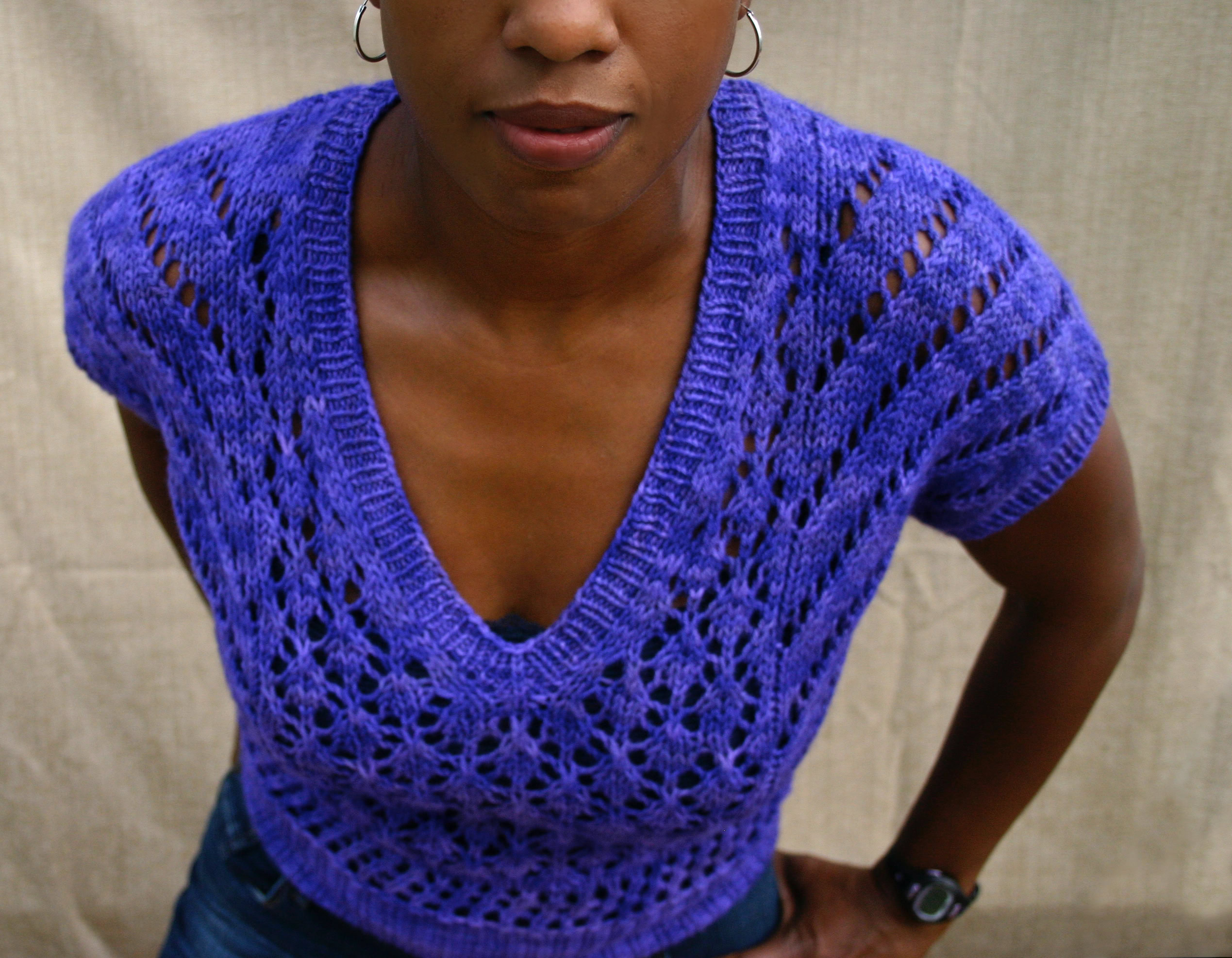 This is The Boss. A commanding, yet intriguing open gauge lace top, with V-neck and integral short sleeves. It is knitted flat in 2 pieces (front and back) from the bottom up, then seamed together. The hemline, the neck line and sleeve ribbings are picked up, then worked in the round using circular needles.