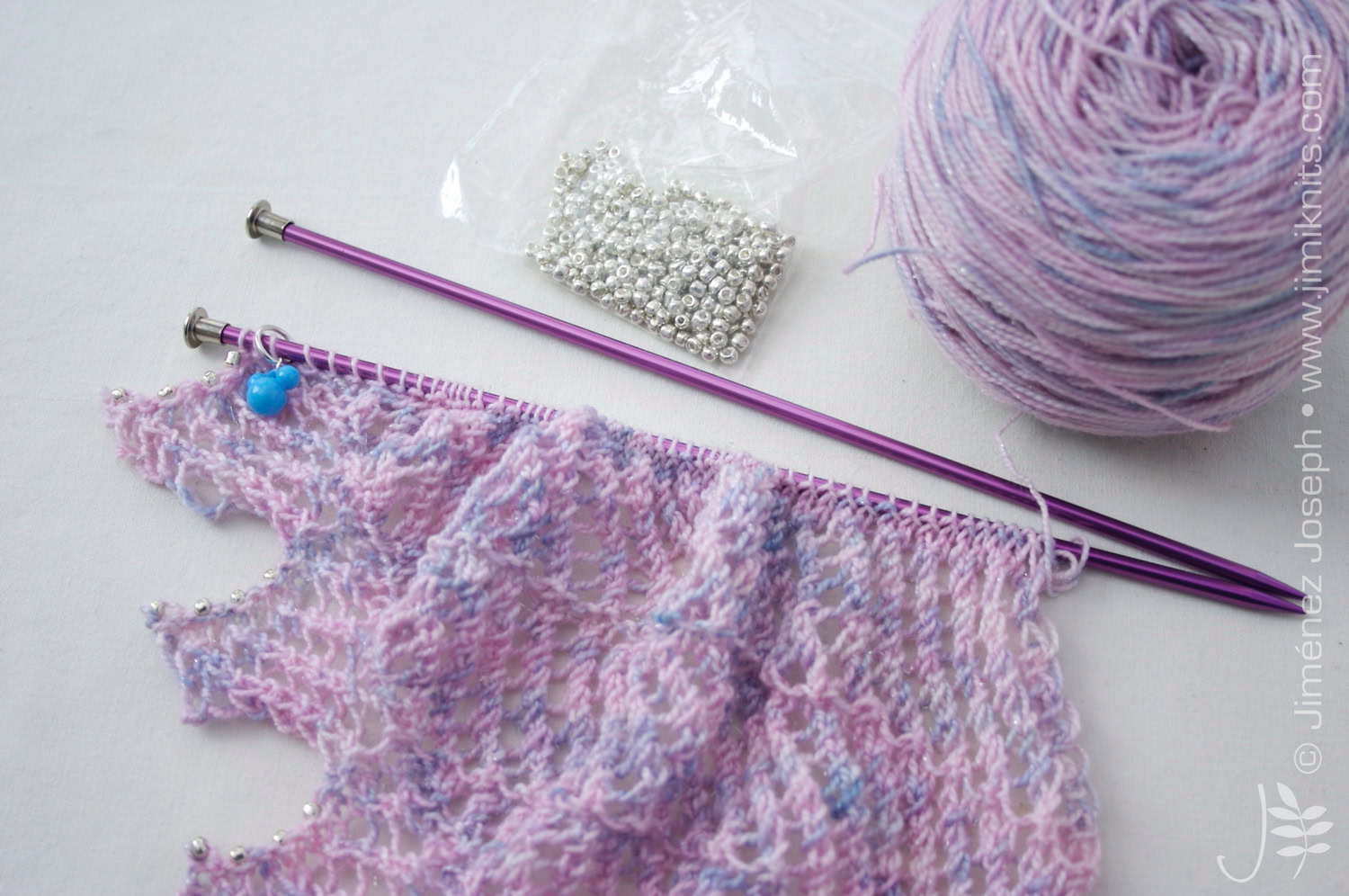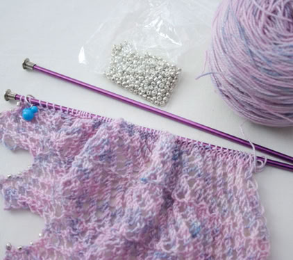 4mm (US 6) (or size required to get gauge) straight needles, or circular needles of 60cm (24”) or longer; 1 stitch marker; 0.75mm crochet bead hook; 3mm (US 2.5) crochet hook (or similar size) and a yarn needle for weaving in ends.