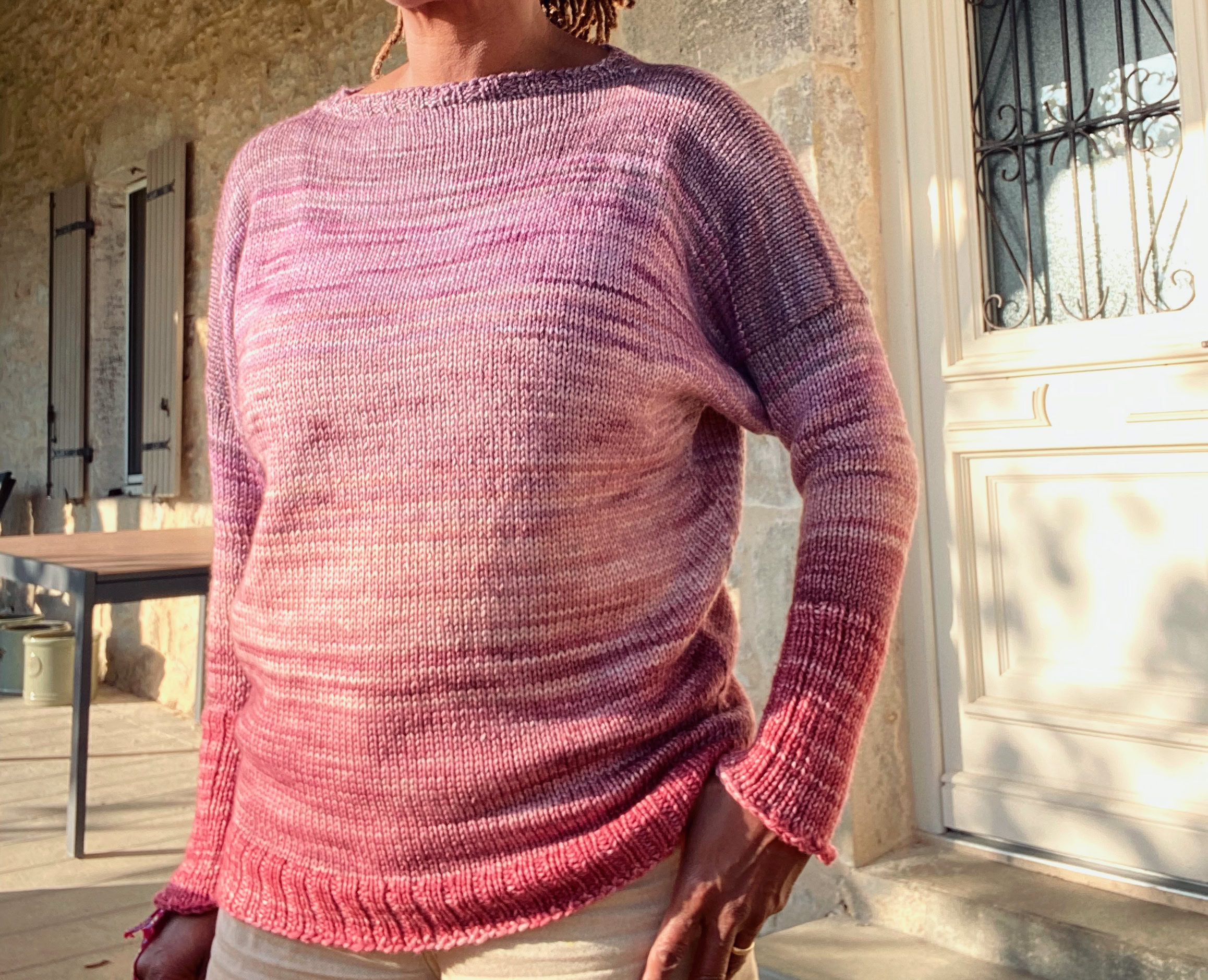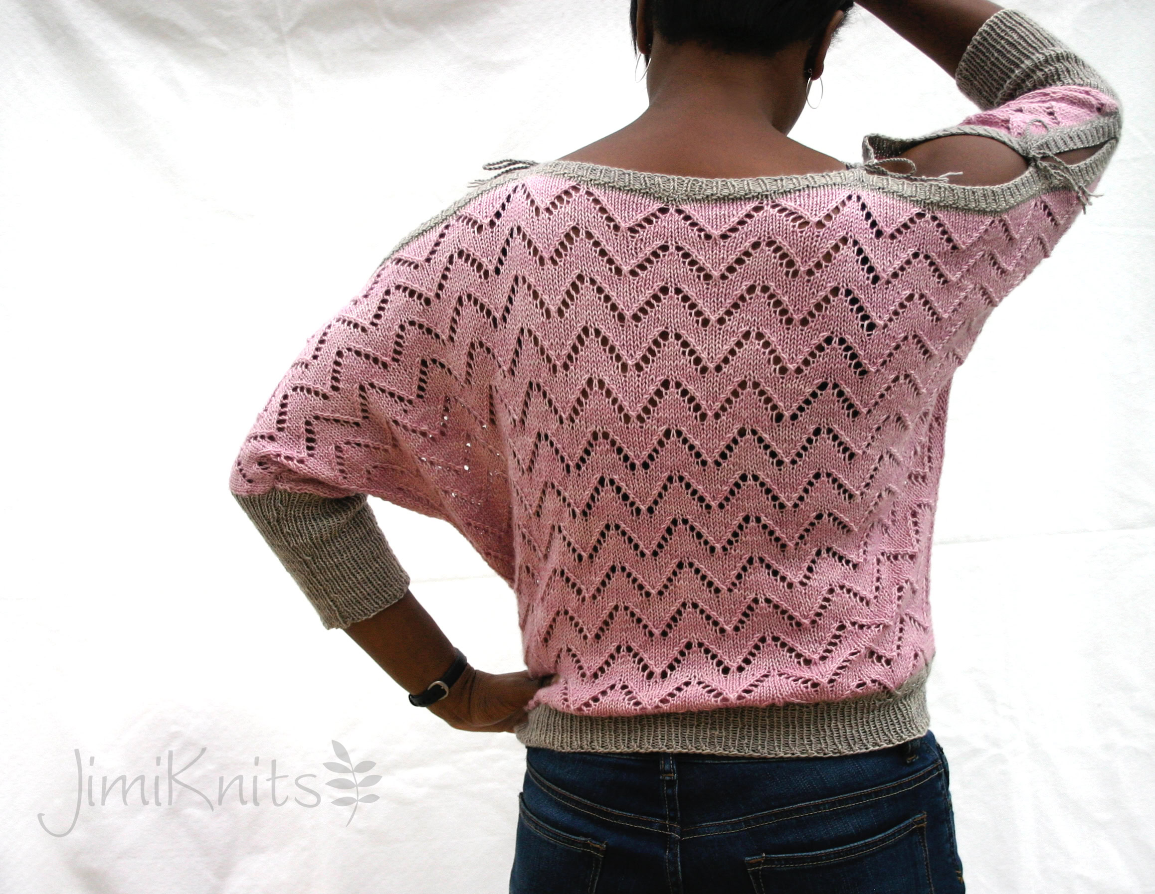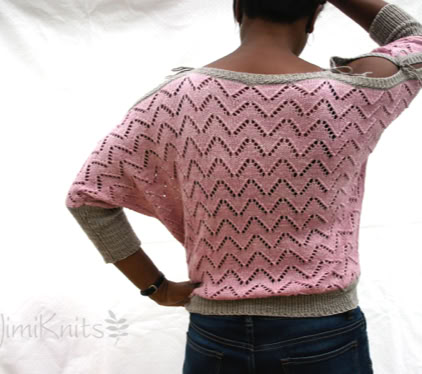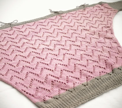 Chicane (and Chicane Lite) is a boat-neck lacy top with dolman sleeves and tie cord shoulders. A versatile design that is knitted flat and from the top-down as a custom-fit construction. Ideal for many body shapes and yarn types. Options: sew up the shoulders for a classic look, or use contrasting colours for ribbing trims.