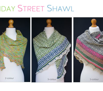 Friday Street Shawl gives an appreciative nod to the traditional Hap shawl, but with a modern twist. With stripes, slipped stitch texture and lace edging, this shawl pattern offers a choice of 2-colour, 3-colour or 5-colour options. A great way to try out colour combinations and use up odd skeins of yarn.