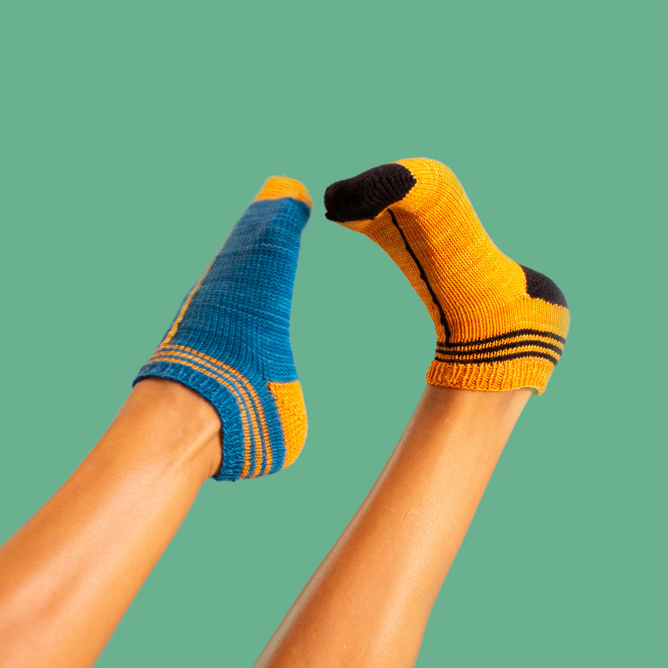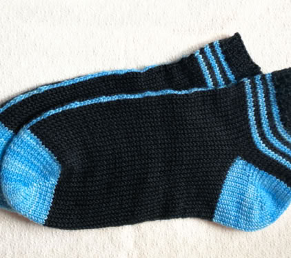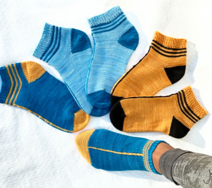 InLine Socks - is a 2-colour sporty ankle sock featuring a single stitch line that runs up the centre. These socks are worked in the round from the toe-up using circular needles, with an afterthought heel.