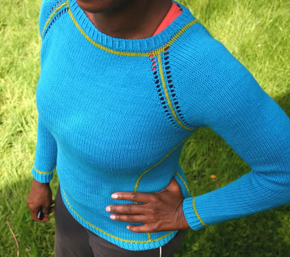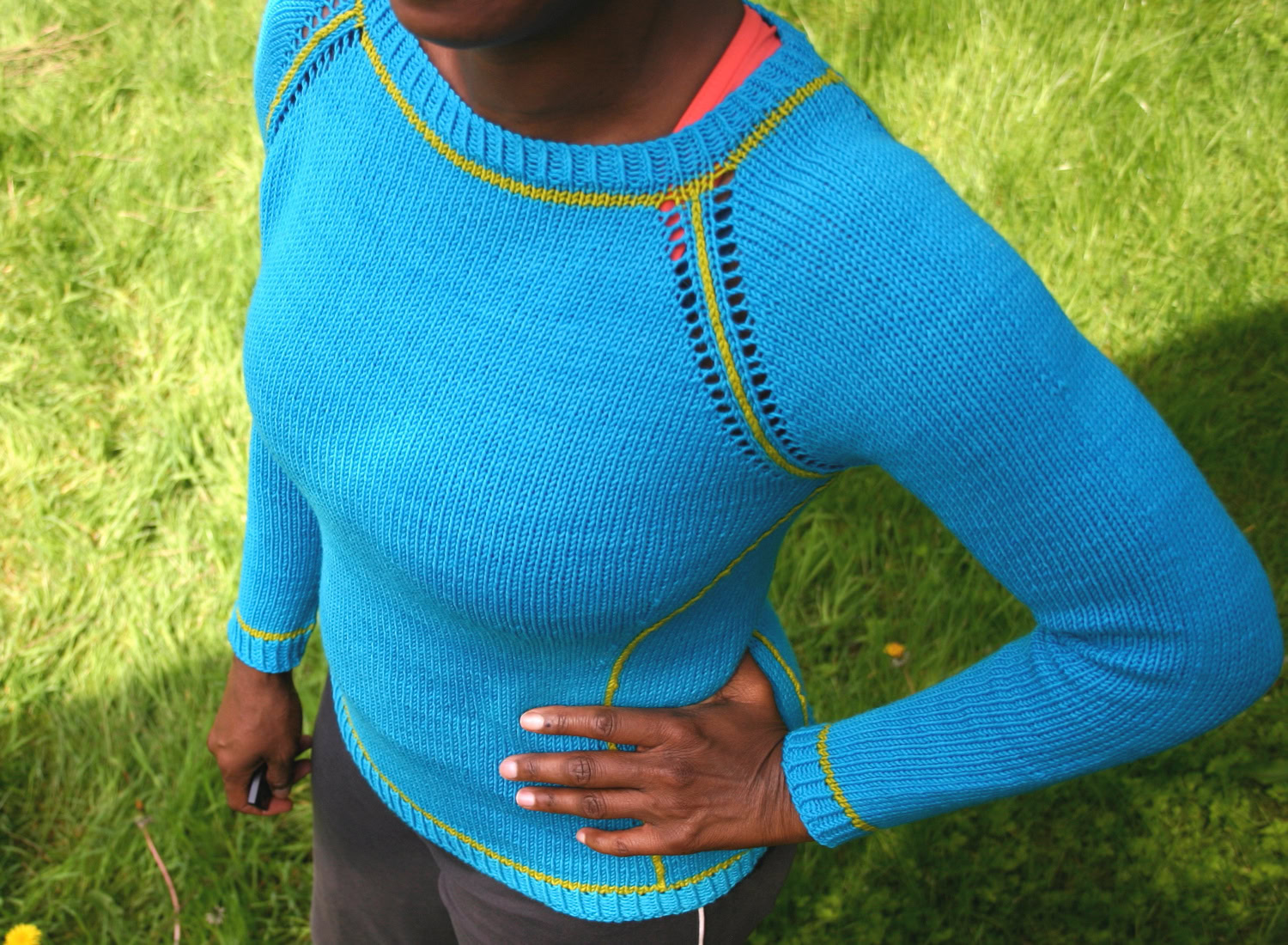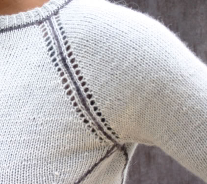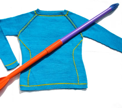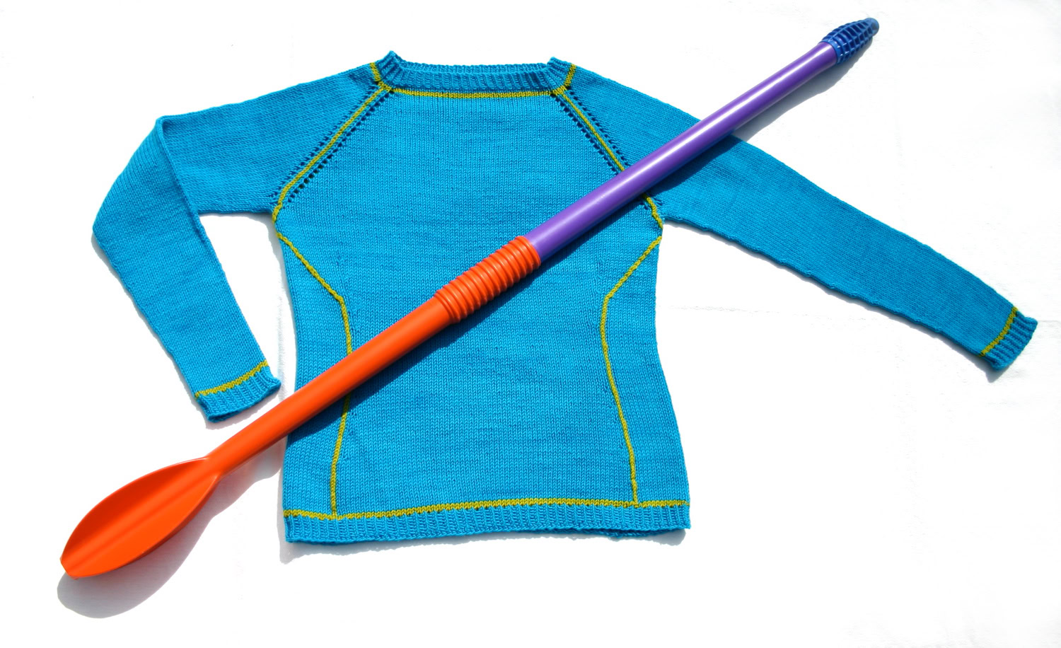 Javelin is a unisex sweater with raglan sleeves and contrasting lines that follow the sweater from neckline to hemline. It is knitted from the top-down, seamless and in the round. It contains 4 contrast colour lines that are carried vertically throughout the length of the sweater on separate yarn bobbins.