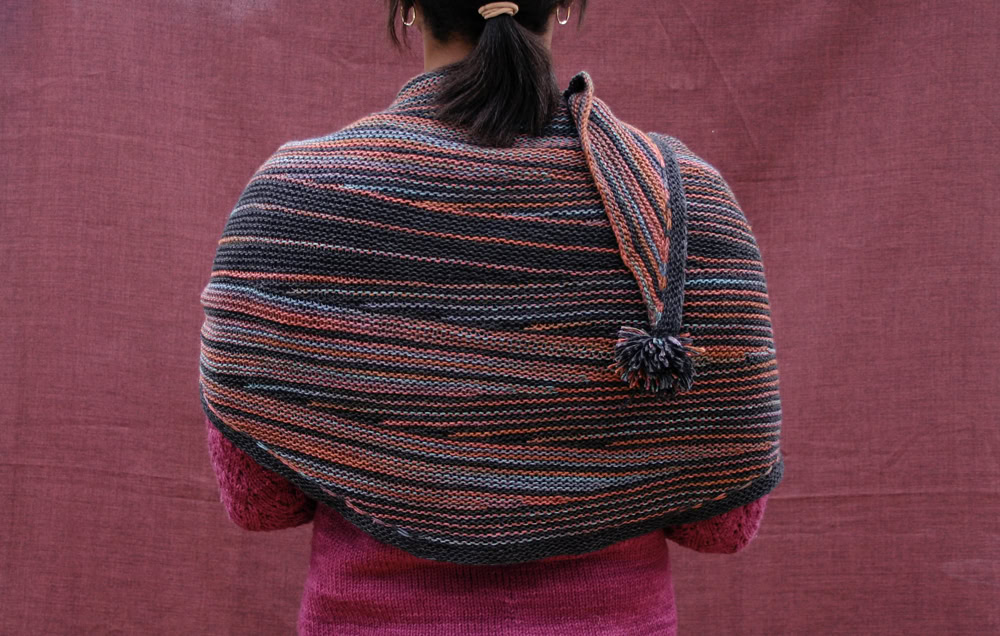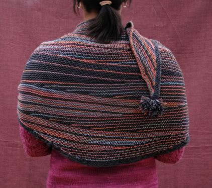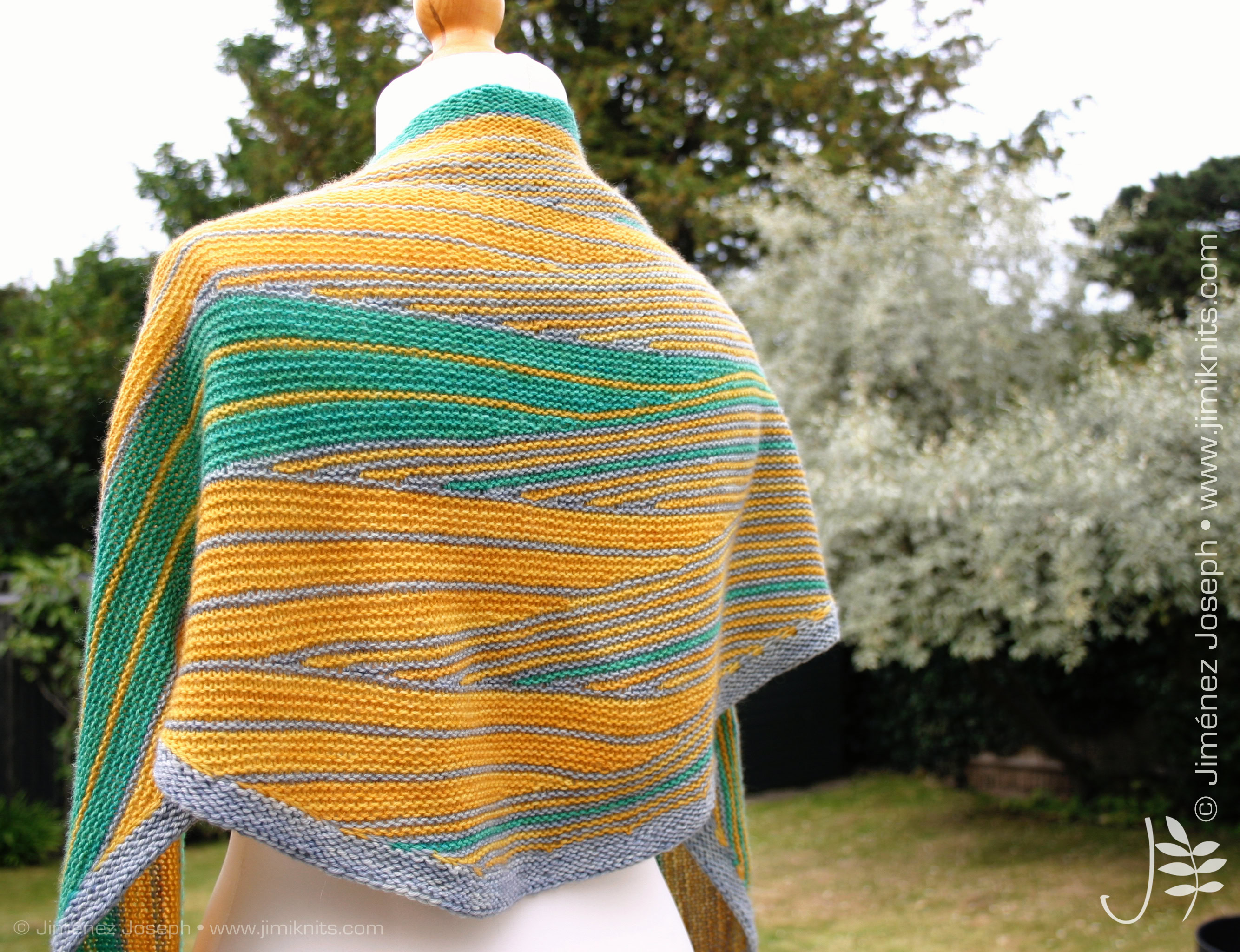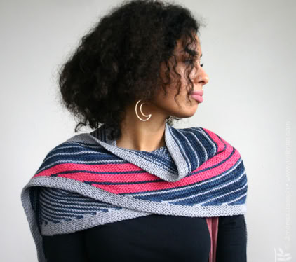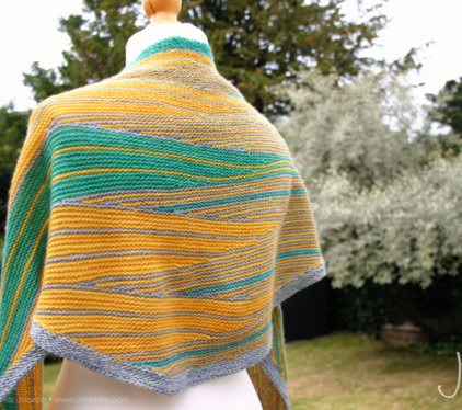 LongStuff - A long and narrow shawl, made using 2 or more colours of yarn. It is knitted from the bottom-up with meandering short row stripes that build up as you go. The edging is picked up and knitted to form a neat border. Go as creative as you like with colour!