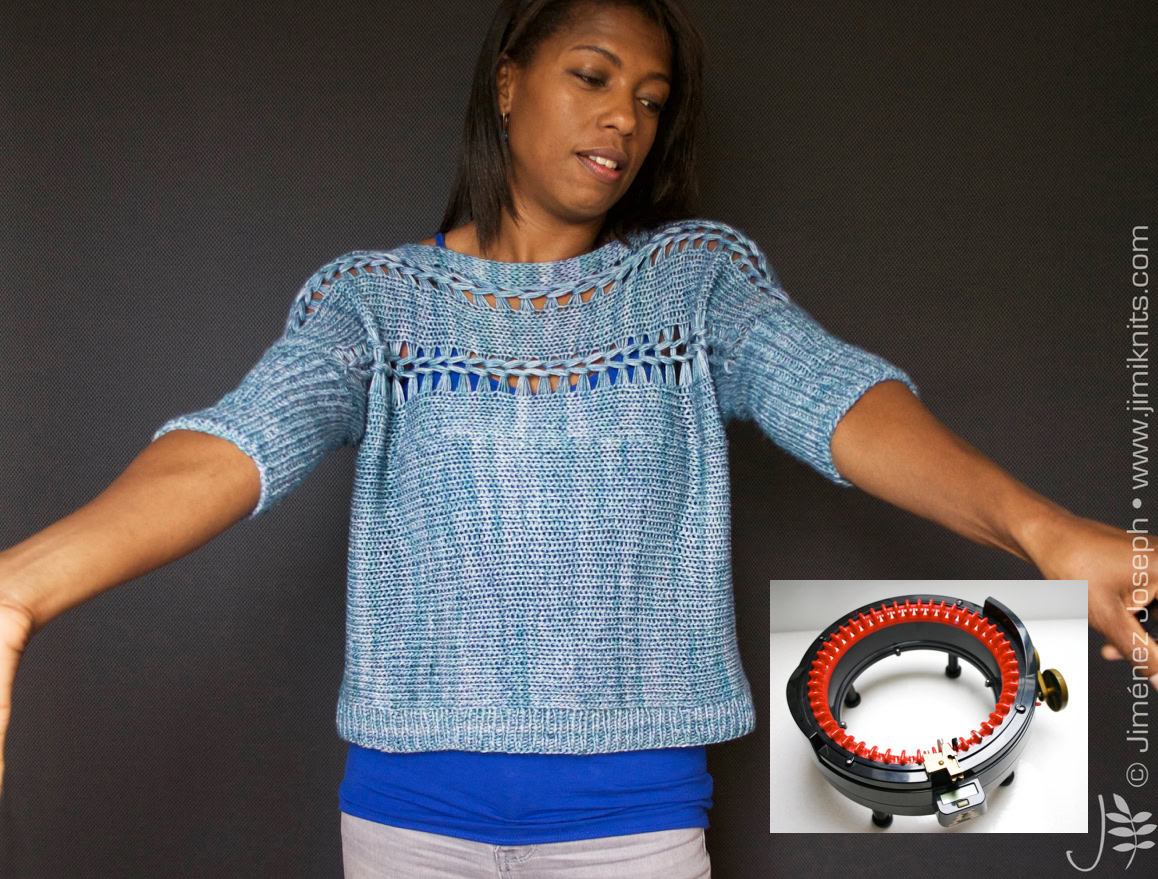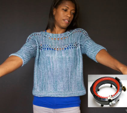 Pixham - Addi Express is a relaxed-fitting top featuring braided stitches that run across the upper body. It is made sideways, flat and in pieces using the Addi Express King Size (46pin) Circular Knitting Machine, while the ribbing trims are hand knitted in the round using circular needles. The braiding feature is worked using a crochet hook. The top is designed to fit loosely and have an open fabric.