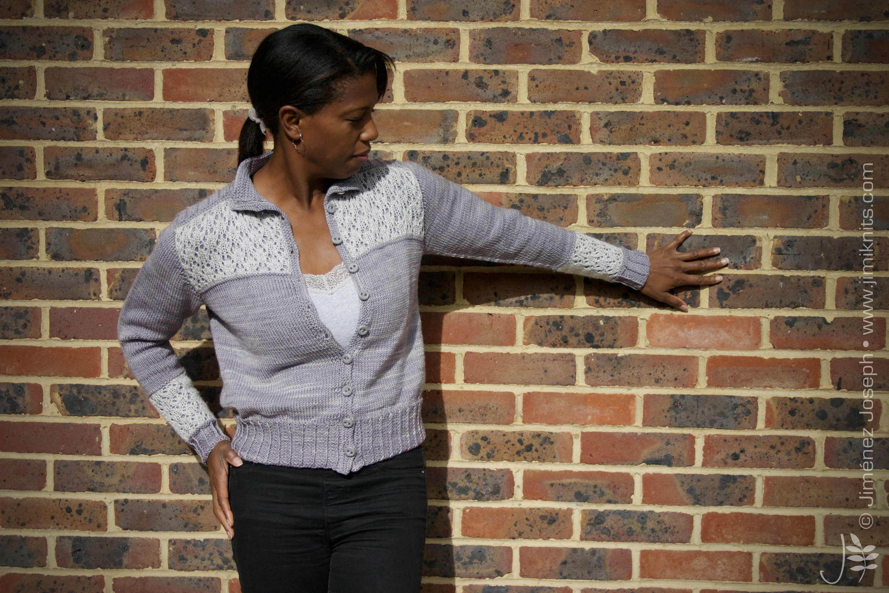 Polesden Lacy has a nostalgic style with a modern twist. It’s a blouson style cardigan with slimline sleeves, made using a DK/Worsted weight yarn base and a contrast colour lace overlay in 4ply/Fingering weight yarn. It is worked flat, from the top-down for the upper half. It is then joined together to work seamlessly down to the hemline, allowing you to adjust for your desired length.