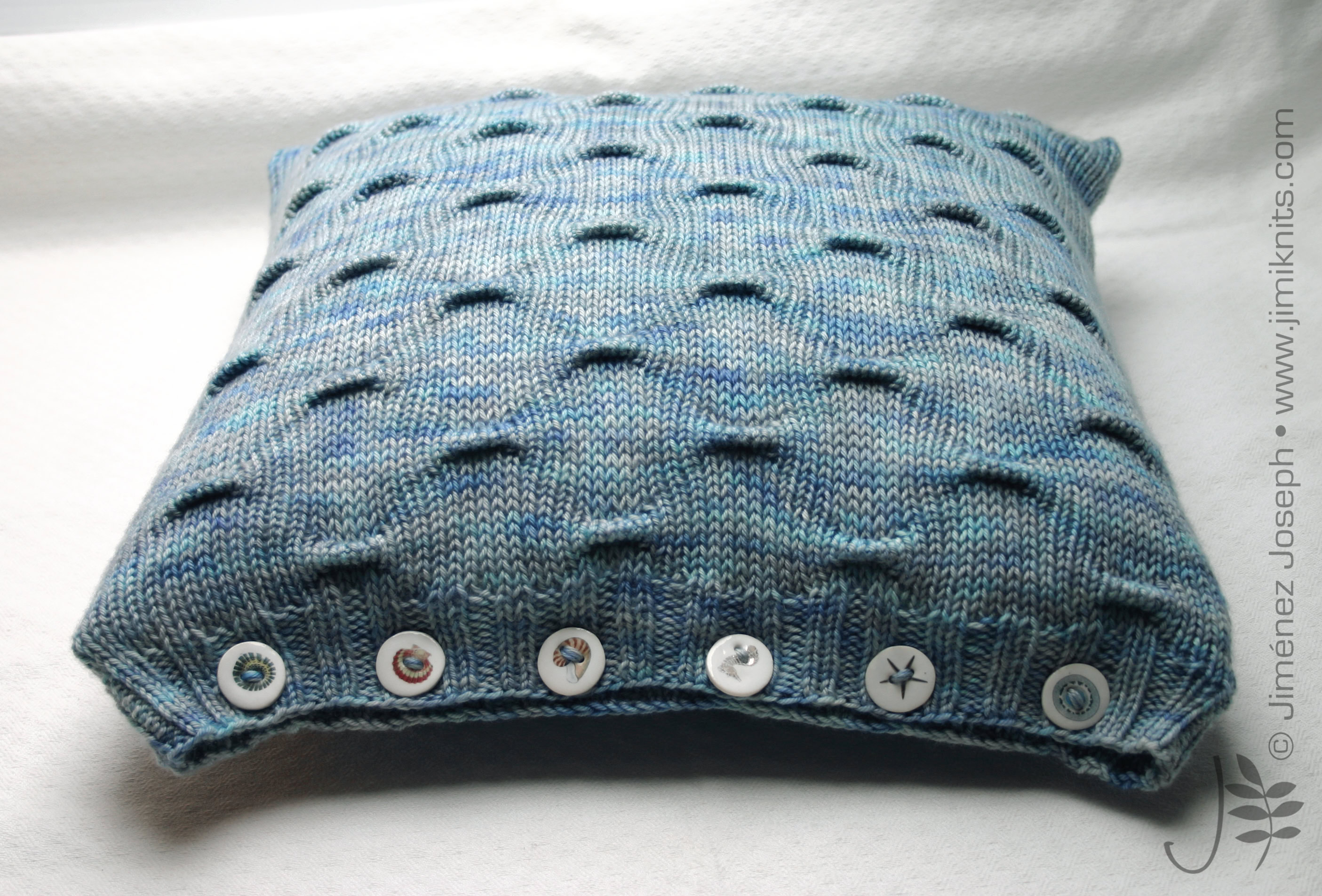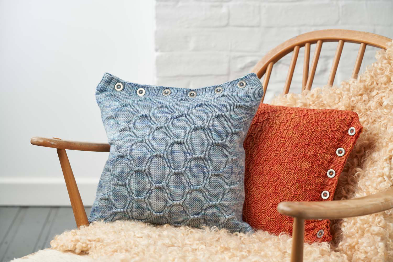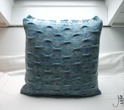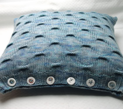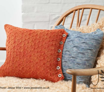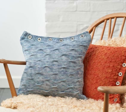 Saturnus Cushions - these cushion covers are cast on at the button band. By using the working yarn, rather than a provisional waste yarn, for the crochet cast on, the cast-on edge matches the cast-off edge perfectly. The body of the cushion is worked back and forth in your chosen grab stitch pattern, before ending with a buttonhole band. The cover is then seamed with mattress stitch and buttons are sewn on to the button band. Fill your cushion cover with a cushion pad and enjoy your work!