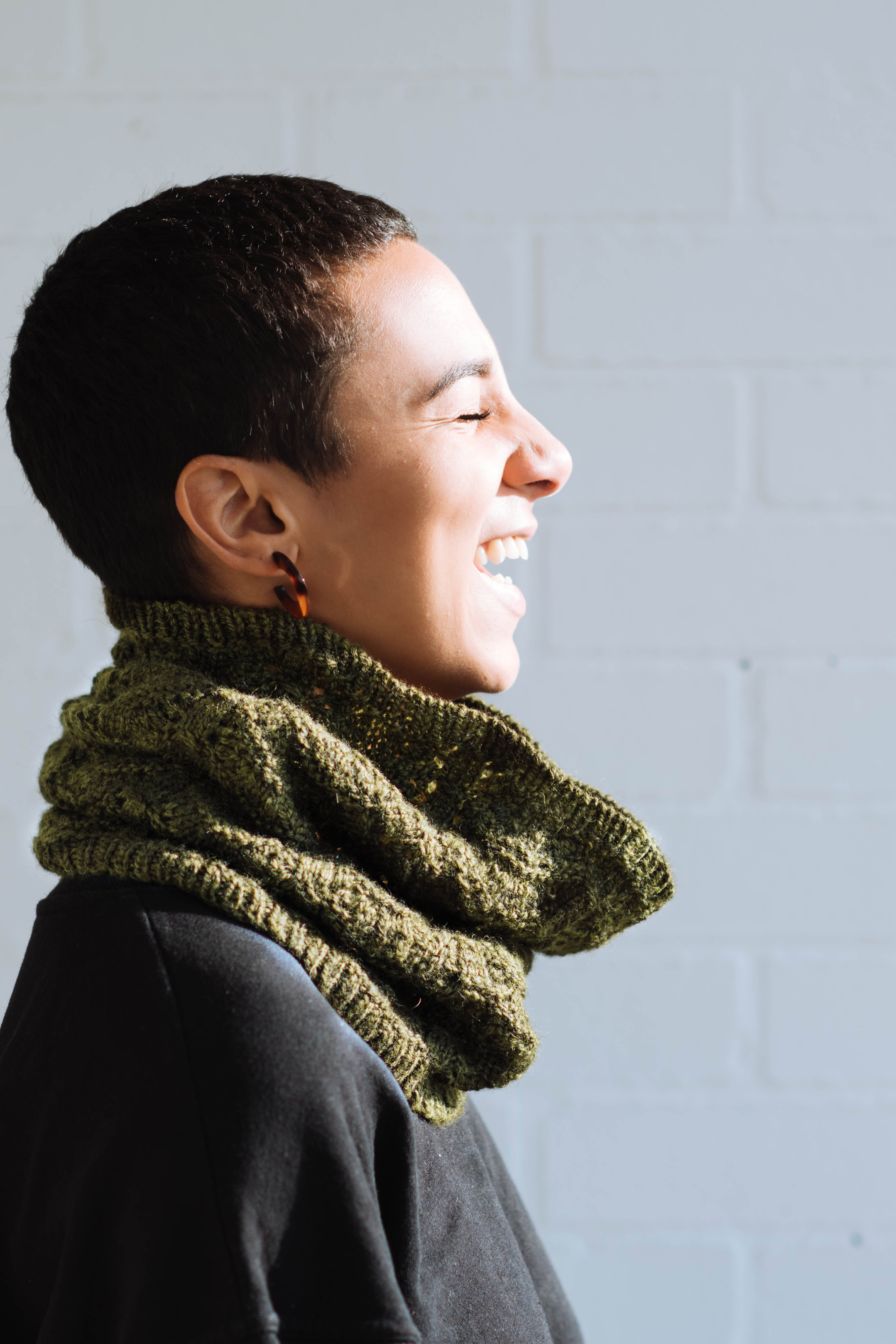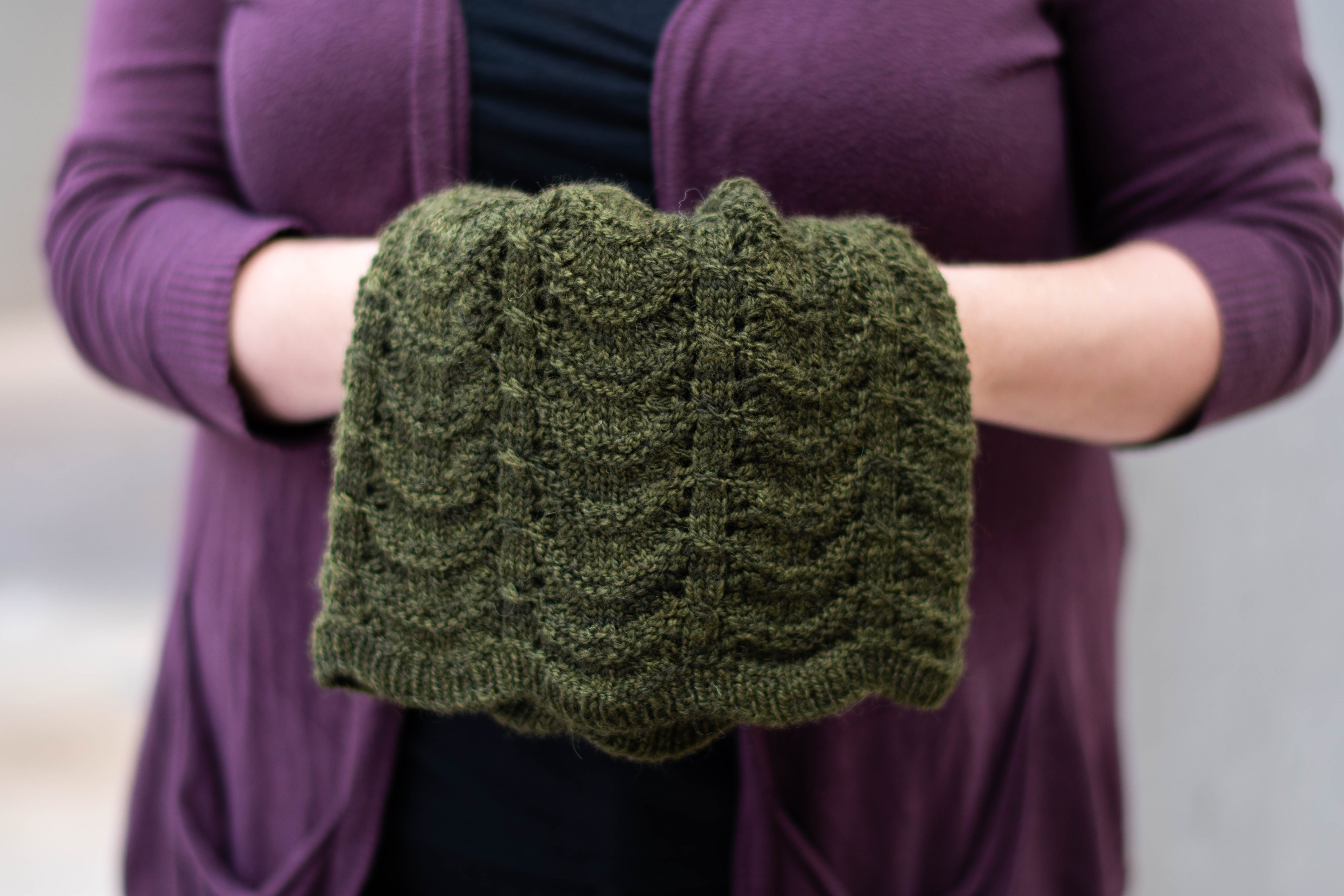 Yzzy Cowl is a part lace and part cable neck warmer with scalloped edge and textural patterning. A cosy cowl that is made in the round from the bottom up using circular needles. This special combination of textures creates visual interest as well as comfort and warmth.